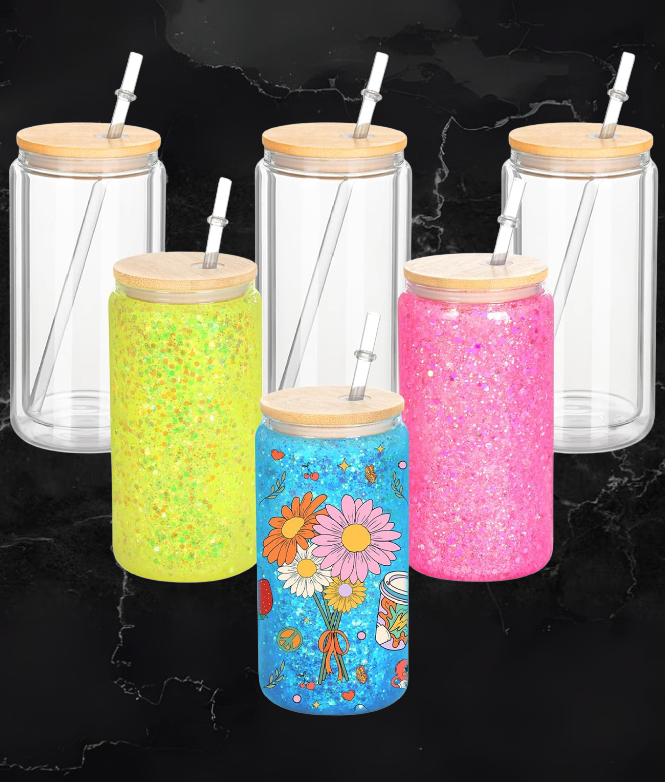 These eye-catching snow globe glitter cups are fully customizable to match your vibe. Choose your favorite glitter color(s) and personalize the outer design with a wrap that suits your style!
