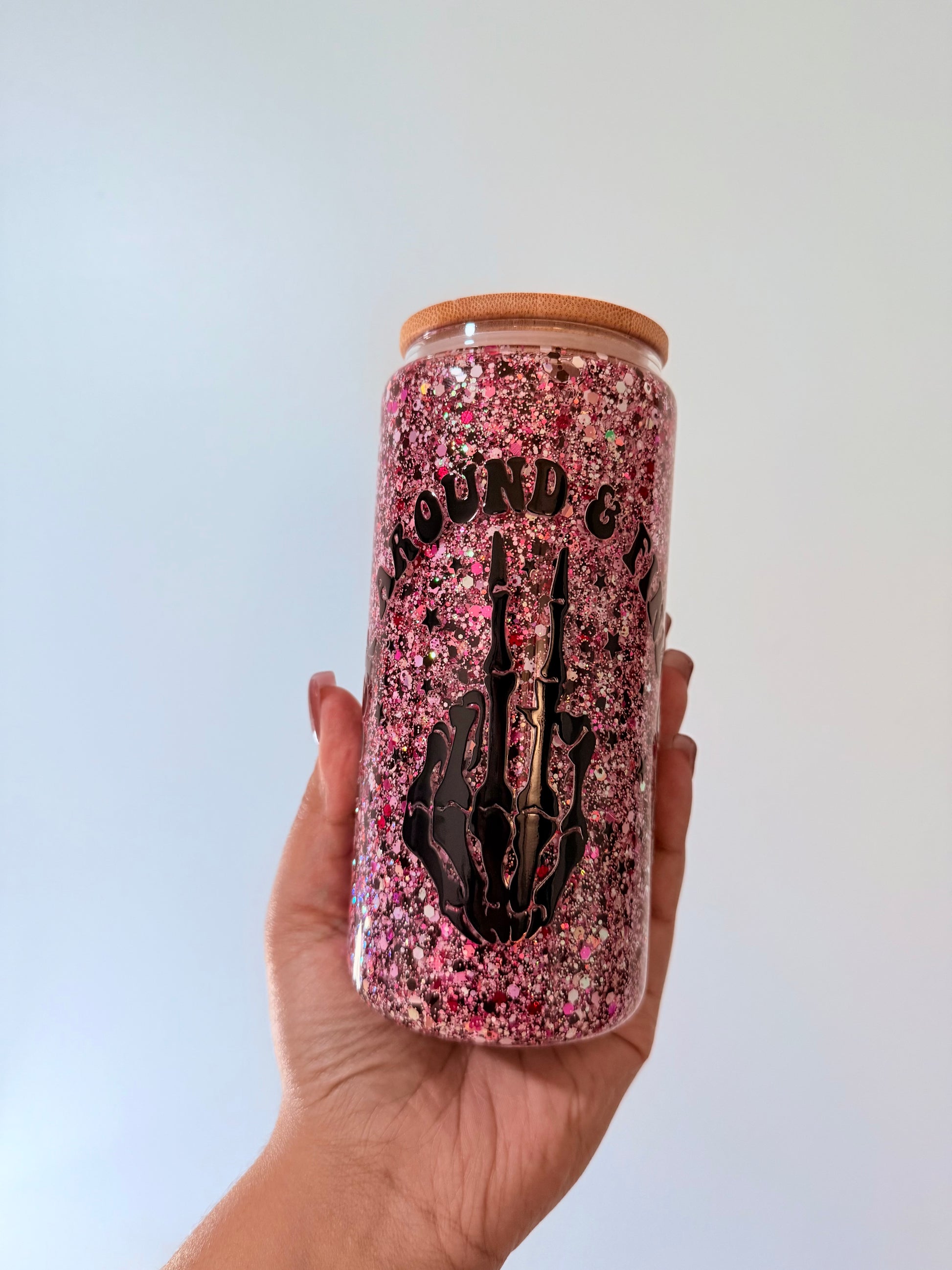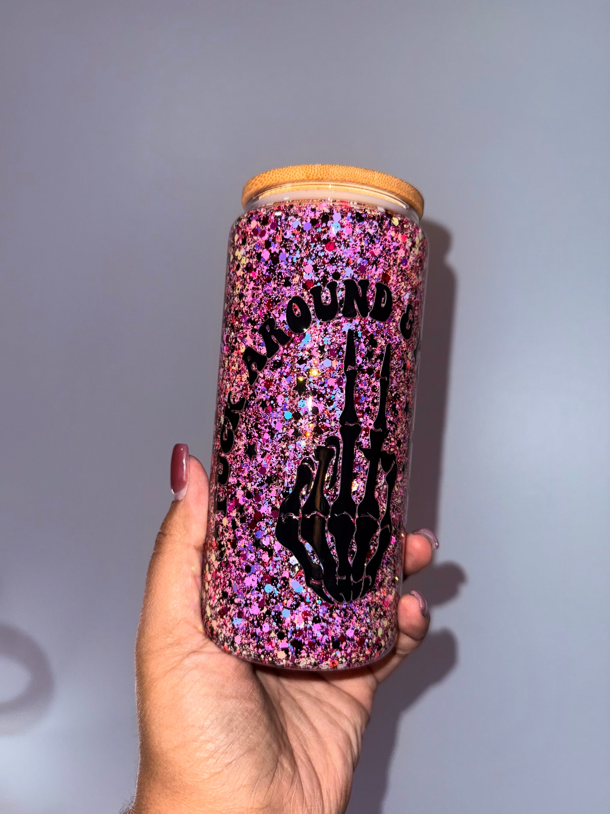 Ready to ship premade glass cup. Decal says “f*ck around and find out” and picture shows with/without flash.